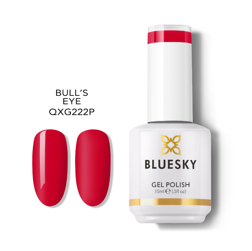 Bluesky Bull’s eye – QXG222P. Έντονο κόκκινο ημιμόνιμο βερνίκι με δυναμική και εντυπωσιακή αισθητική. Προσφέρει πλήρη κάλυψη (full cover) από την πρώτη στρώση, με ομοιόμορφη εφαρμογή χάρη στη ρευστή του σύσταση. Ιδανικό για έντονες και κομψές εμφανίσεις, με διάρκεια έως και 3 εβδομάδες.